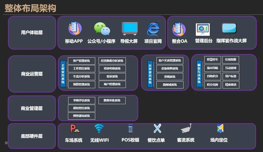 每一位信息人心里都有一本九陰真經(jīng),類似于所有供應(yīng)商解決方案圖,可以展示比較復(fù)雜的架構(gòu)和多維度的層次。這都是經(jīng)過多年摸爬滾打?qū)W習(xí)來的自己認(rèn)為能Hold住的范圍。本人也不例外,我規(guī)劃的方案圖分軟硬件兩個(gè)維度,涵蓋底部硬件層、商業(yè)管理層、商業(yè)運(yùn)營層、用戶體驗(yàn)層,每一層又分很多小業(yè)務(wù)系統(tǒng)和硬件來支撐。